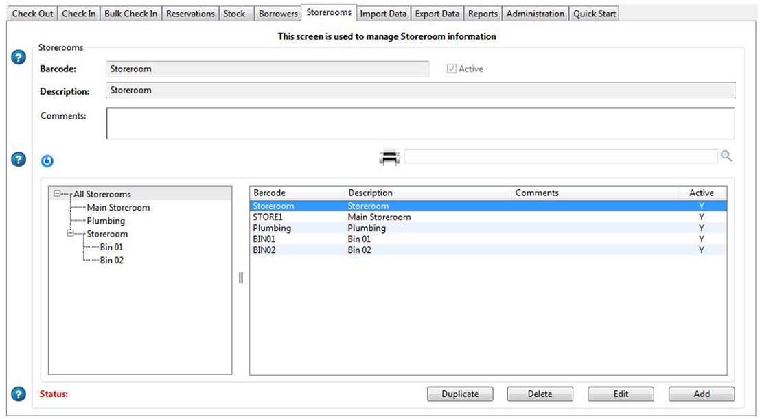 A listing of all of your storerooms and the ability to add, delete and modify your storeroom data.
